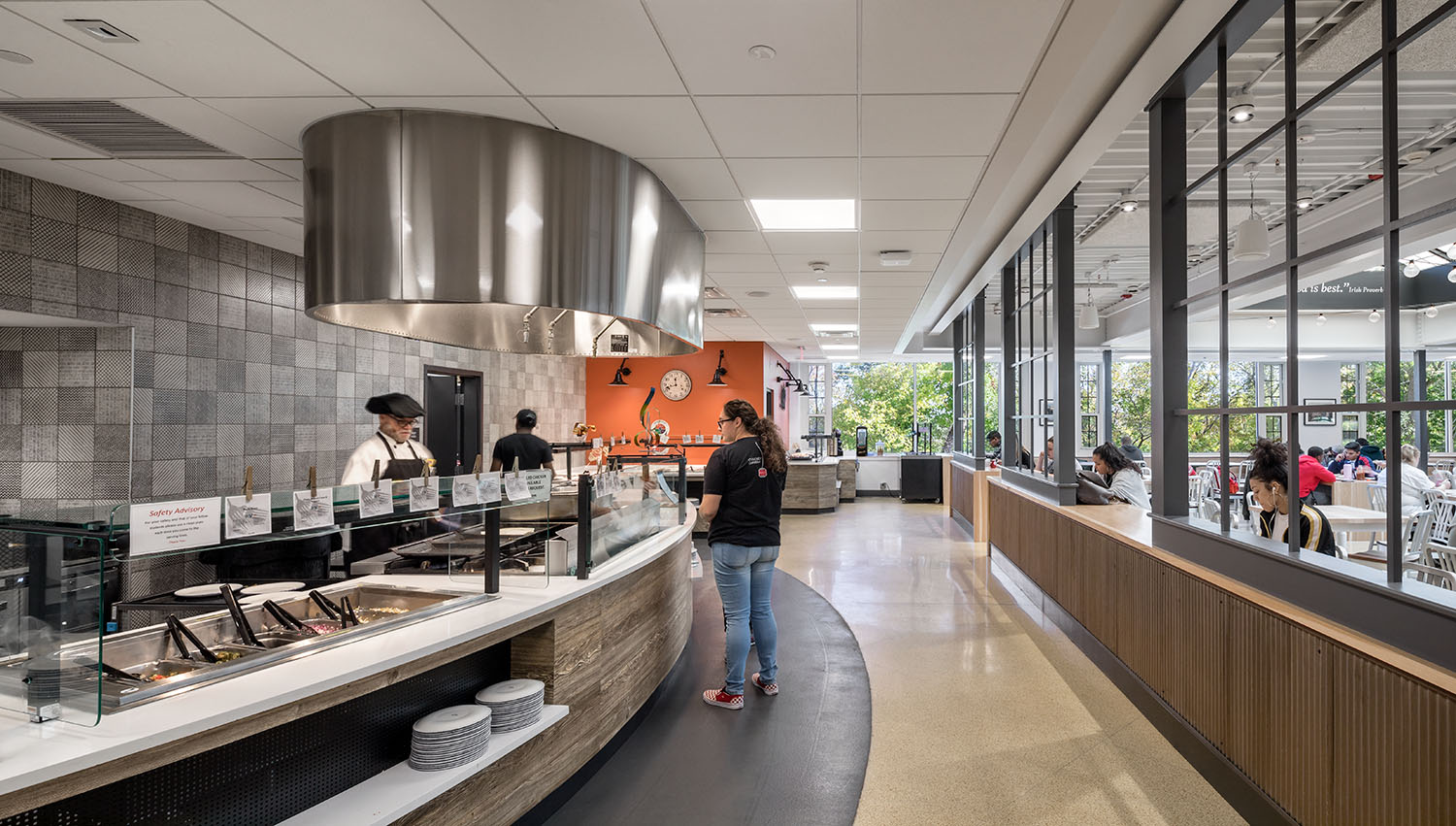 EDM provided engineering services for this 5,000 SF renovation of a university dining facility, focused on serving local farm-to-table fare and designed to recall a Farmer’s Market. At its center, a broad new skylight enlivens the space with daylight. An elongated community table, made from natural hickory, and variety of table and seating options extend under the new skylight. Various food serving stations and a grill surround the open seating area. “Market lights” under the skylight extend the ambiance into the evening hours. A living “green” wall shelters the dishwashing station from the main dining area. An adjacent underutilized study space was transformed into a comfortable, casual café space, offering additional soft seating options and a gas-fired fireplace.
